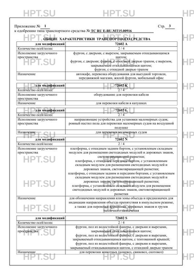 | Оборудование ТС | страховочный трос или цепь; опорное колесо или стойка по заказу: запасное колесо; встроенная мебель (для 72602 A, 72602 S, 72602 U); кондиционер и (или) холодильное оборудование (для 72602 A, 72602 S, 72602 U); трапы для заезда (для 72602 В, 72602 L, 72602 Р); пластиковая крышка (для 72602 В); фальшборта (для 72602 Р); передний щит (для 72602 Р); тентованная крыша (для 72602 S); инструментальный ящик; лебёдка |