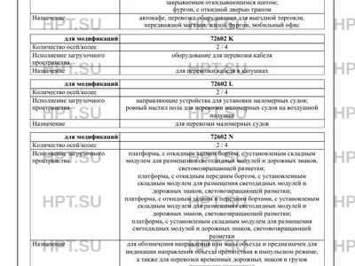 | Назначение | автокафе, перевозка оборудования для выездной торговли, передвижной магазин, жилой фургон, мобильный офис для перевозки кабеля в катушках для перевозки маломерных судов для обозначения направления или зоны объезда и предназначен для индикации направления объезда препятствия в импульсном режиме, а также для перевозки временных дорожных знаков и грузов различного назначения для перевозки животных (коневоз, свиновоз, скотовоз) для перевозки мототехники, колесной техники, грузов и оборудования |