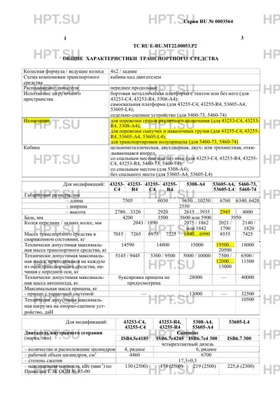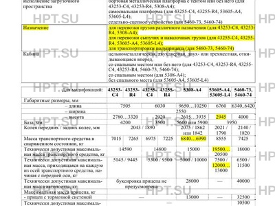 | Назначение | для перевозки грузов различного назначения (для 43253-С4, 43253- R4, 5308-А4); для перевозки сыпучих и навалочных грузов (для 43255-С4, 43255- R4, 53605-A4, 53605-L4); для транспортировки полуприцепа (для 5460-73, 5460-74) |