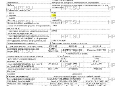 | Оборудование ТС | насос пожарный, сигнально-громкоговорящая установка и три проблесковых маячка синего цвета, радиооборудование, антенна, аппаратура спутниковой навигации, устройство вызова экстренных оперативных служб, по заказу: предпусковой подогреватель двигателя, лебедка, коробка отбора мощности |
