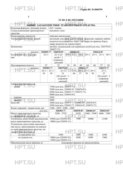 | Тип ТС | Категория транспортного средства: M3, автобус класса I-II – кроме мод. 320370-0?, 32047?-0? M3 – для мод. 320370-0?, 32047?-?? Экологический класс транспортного средства: 4 - всех мод. кроме 3204?2-10 5 - для мод. 3204?2-10 Использование автобусов для перевозки пассажиров в междугородном сообщении допускается только для автобусов, оснащенных ремнями безопасности. Данное Одобрение типа транспортного средства является распространением Одобрения типа транспортного средства № E-RU.МТ22.B.00130.Р5, выданного до вступления в силу технического регламента Таможенного союза "О безопасности колесных транспортных средств". |