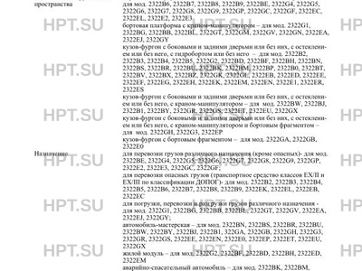 | Назначение | для перевозки грузов различного назначения (кроме опасных)- для мод. 2322BE, 2322G4, 2322G5, 2322G6, 2322G7, 2322G8, 2322G9, 2322GP, 2322E2, 2322E3, 2322GC, 2322GF; для перевозки опасных грузов (транспортное средство классов EX/II и EX/III по классификации ДОПОГ)- для мод. 2322B2, 2322B3, 2322B4, 2322B5, 2322B6, 2322B7, 2322B8, 2322B9, 2322EK, 2322EL, 2322EB, 2322EC для погрузки, перевозки и разгрузки грузов различного назначения - для мод. 2322G1, 2322BG, 2322BB, 2322BL, 2322GT, 2322GV, 2322EA, 2322EJ, 2322GY; автомобиль-мастерская - для мод. 2322BN, 2322BS, 2322BR, 2322BU, 2322BW, 2322BY, 2322BJ, 2322B1, 322GA, 2322GB, 2322GH, 2322G3, 2322GR, 2322GS, 2322EE, 2322EN, 2322E0, 2322EP, 2322ET, 2322EU, 2322GX жилой модуль - для мод. 2322G2, 2322BF, 2322BD, 2322BH, 2322ED, 2322EM аварийно-спасательный автомобиль - для мод. 2322BK, 2322BM, 2322BP, 2322B0, 2322EG, 2322ER электротехническая лаборатория - для мод. 2322BT, 2322BV, 2322BX, 2322BZ, 2322EH, 2322ES дорожный мастер - для 2322GK, 2322GL, 2322GM, 2322GN, 2322EF, 2322E1. |