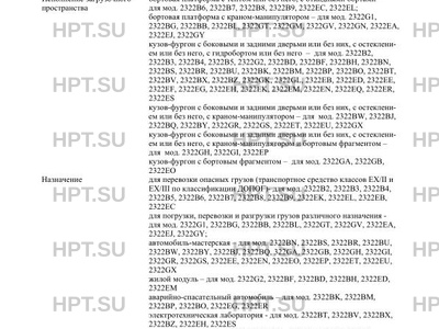 Исполнение загрузочного пространства бортовая платформа с тентом или без него, c откидными бортами - для мод. 2322B6, 2322B7, 2322B8, 2322B9, 2322EC, 2322EL; бортовая платформа с краном-манипулятором - для мод. 2322G1, 2322BG, 2322BB, 2322BL, 2322GT, 2322GM, 2322GV, 2322GN, 2322EA, 2322EJ, 2322GY кузов-фургон с боковыми и задними дверьми или без них, с остеклением или без него, с гидробортом или без него - для мод. 2322B2, 2322B3, 2322B4, 2322B5, 2322G2, 2322BD, 2322BF, 2322BH, 2322BN, 2322BS, 2322BR, 2322BU, 2322BK, 2322BM, 2322BP, 2322BO, 2322BT, 2322BV, 2322BX, 2322BZ, 2322GK, 2322GL, 2322EB, 2322ED, 2322EE, 2322EF, 2322EG, 2322EH, 2322EK, 2322EM, 2322EN, 2322EQ, 2322ER, 2322ES кузов-фургон с боковыми и задними дверьми или без них, с остеклением или без него, c краном-манипулятором - для мод. 2322BW, 2322BJ, 2322BQ, 2322BY, 2322GR, 2322GS, 2322ET, 2322EU, 2322GX кузов-фургон с боковыми и задними дверьми или без них, с остеклением или без него, c краном-манипулятором и бортовым фрагментом - для мод. 2322GH, 2322GI, 2322EP кузов-фургон c бортовым фрагментом - для мод. 2322GA, 2322GB, 2322EO
