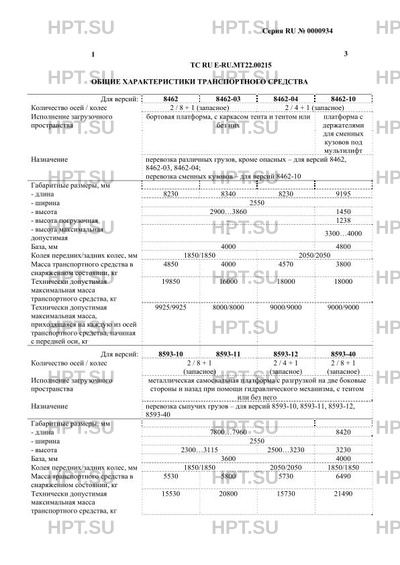 | Дополнительная информация | На данный тип транспортного средства до вступления в силу технического регламента Таможенного союза «О безопасности колесных транспортных средств» было выдано Одобрение типа транспортного средства № E-RU.MT22.В.00708. Коммерческое наименование Модификации Версии Прицеп грузовой двухосный 8462 8462, 8462-03, 8462-04 Прицеп-контейнеровоз двухосный 8462-10 8462-10 Прицеп самосвальный двухосный 8593-10 8593-10, 8593-11, 8593-12, 8593-20, 8593-21, 8593-22, 8593-40 |