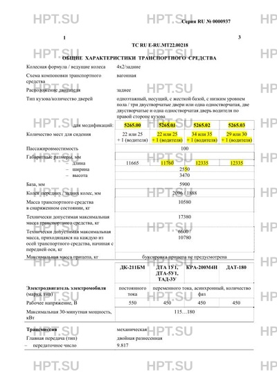 | Дополнительная информация | Троллейбус класса I Данное Одобрение типа транспортного средства является распространением Одобрения типа транспортного средства № E-RU.MT22.В.00259.Р1, выданного до вступления в силу технического регламента Таможенного союза «О безопасности колесных транспортных средств». |