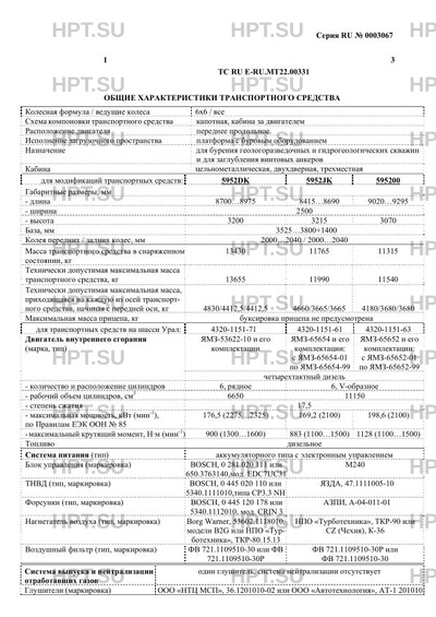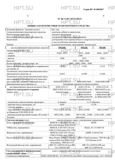 | Тип ТС | 5952?? изготовлен на шасси Урал тип 4320, модификации 4320-1151-61, -63, -71. 5952DK – коммерческое наименование (назначение транспортного средства): передвижная буровая установка ПБУ-2. 5952JK – коммерческое наименование (назначение транспортного средства): буровая установка ЛБУ-50. 595200 – коммерческое наименование (назначение транспортного средства): агрегат для заглубления винтовых анкеров АЗА-3. |
