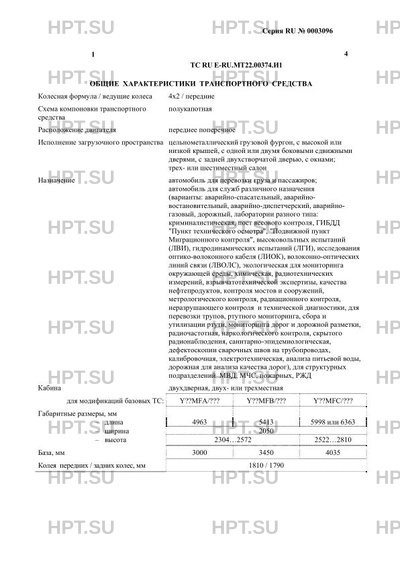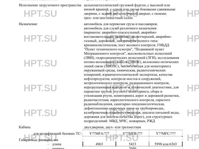 | Исполнение загрузочного пространства | цельнометаллический грузовой фургон, с высокой или низкой крышей, с одной или двумя боковыми сдвижными дверями, с задней двухстворчатой дверью, с окнами; трехили шестиместный салон |