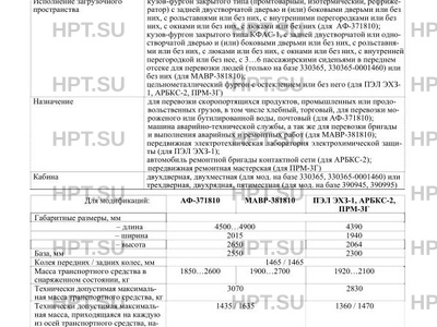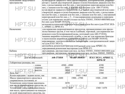 | Дополнительная информация | Транспортные средства не предназначены для перевозки опасных грузов. Транспортные средства: АФ-371810, МАВР-381810 изготавливаются: на шасси УАЗ тип 3303 модификации 330365-0001460, на базе транспортного средства УАЗ типа 3303 модификации 330365, на базе транспортного средства УАЗ типа 3909 модификации 390945; ПЭЛ ЭХЗ-1, АРБКС-2, ПРМ-3Г изготавливаются: на базе транспортного средства УАЗ типа 3909 модификации 390995. |