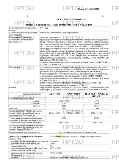 | Тип ТС | Транспортные средства не предназначены для перевозки опасных грузов. Транспортные средства: АФ-371810, МАВР-381810 изготавливаются: на шасси УАЗ тип 3303 модификации 330365-0001460, на базе транспортного средства УАЗ типа 3303 модификации 330365, на базе транспортного средства УАЗ типа 3909 модификации 390945; ПЭЛ ЭХЗ-1, АРБКС-2, ПРМ-3Г изготавливаются: на базе транспортного средства УАЗ типа 3909 модификации 390995. |