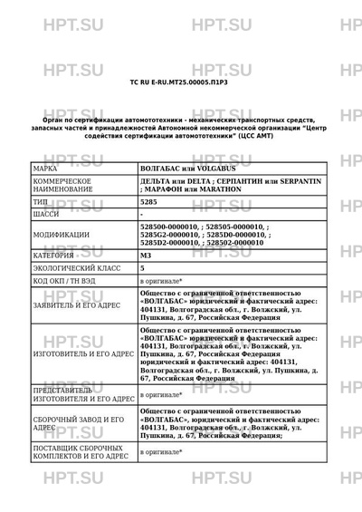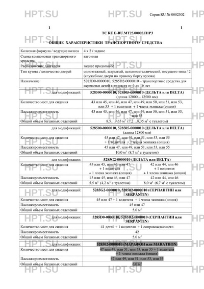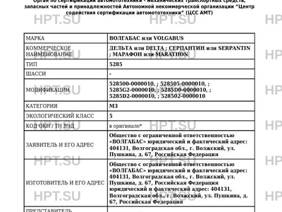 | Дополнительная информация | Транспортные средства ВОЛГАБАС или VOLGABUS типа 5285 относятся к категории М3 класса III. В случае несоответствия параметров транспортных средств значениям, установленным в пункте 2.2 приложения № 5 к техническому регламенту Таможенного союза “О безопасности колесных транспортных средств”, для передвижения транспортных средств по территории государств-членов Таможенного союза необходимо оформление специального разрешения |