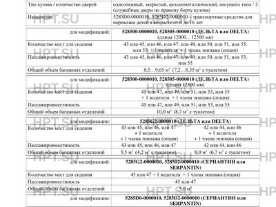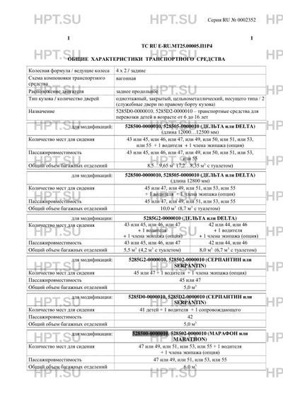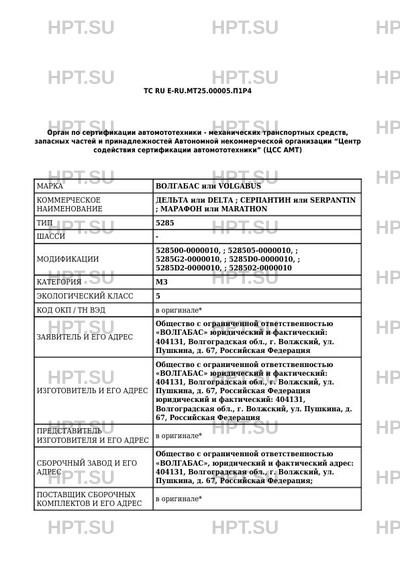 | Дополнительная информация | Транспортные средства ВОЛГАБАС или VOLGABUS типа 5285 относятся к категории М3 класса III. В случае несоответствия параметров транспортных средств значениям, установленным в пункте 2.2 приложения № 5 к техническому регламенту Таможенного союза “О безопасности колесных транспортных средств”, для передвижения транспортных средств по территории государств-членов Таможенного союза необходимо оформление специального разрешения |
