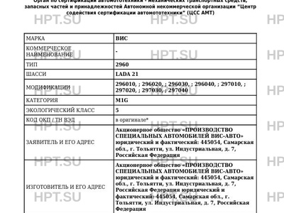 | Предприятие-изготовитель | Акционерное общество «ПРОИЗВОДСТВО СПЕЦИАЛЬНЫХ АВТОМОБИЛЕЙ ВИС-АВТО» юридический и фактический: 445054, Самарская обл., г. Тольятти, ул. Индустриальная, д. 7, Российская Федерация юридический и фактический: 445054, Самарская обл., г. Тольятти, ул. Индустриальная, д. 7, Российская Федерация |