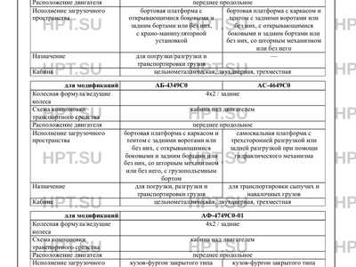 | Оборудование ТС | электронная система контроля устойчивости, устройство вызова экстренных оперативных служб; тент, каркас тента, ворота (для АБ-4349С0); внутреннее освещение кузова, ступенька и поручень, фиксирующие элементы для удержания груза (для АФ-4749С0-0?); холодильная (хладагент R134A) и/или отопительная установка (для АФ-4749С0-02); тент, упор (для АС-4649С0) по заказу: спойлер на крыше кабины, багажный накрышный бокс, подушка безопасности водителя, ремень безопасности с преднатяжителем, кондиционер, электростеклоподъемники, центральный замок, предпусковой подогреватель-отопитель, дополнительный отопитель, ограничитель максимальной скорости; тахограф, внутреннее зеркало заднего вида, телематическое устройство, наружные зеркала заднего вида с обогревом, наружные зеркала заднего вида с электроприводом, наружные зеркала заднего вида с обогревом и электроприводом |