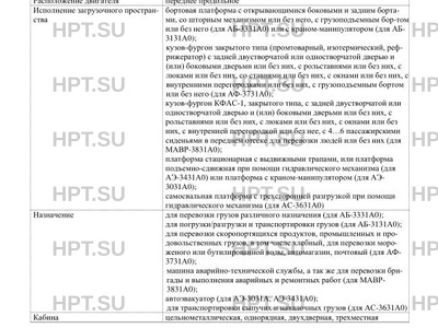 Исполнение загрузочного пространства бортовая платформа с открывающимися боковыми и задним бортами, со шторным механизмом или без него, с грузоподъемным бор-том или без него (для АБ-3331А0) или с краном-манипулятором (для АБ- 3131А0); кузов-фургон закрытого типа (промтоварный, изотермический, рефрижератор) с задней двустворчатой или одностворчатой дверью и (или) боковыми дверьми или без них, с рольставнями или без них, с люками или без них, со ставнями или без них, с окнами или без них, с внутренними перегородками или без них, с грузоподъемным бортом или без него (для АФ-3731А0); кузов-фургон КФАС-1, закрытого типа, с задней двустворчатой или одностворчатой дверью и (или) боковыми дверьми или без них, с рольставнями или без них, с люками или без них, с окнами или без них, с внутренней перегородкой или без нее, с 4…6 пассажирскими сиденьями в переднем отсеке для перевозки людей или без них (для МАВР-3831А0); платформа стационарная с выдвижными трапами, или платформа подъемно-сдвижная при помощи гидравлического механизма (для АЭ-3431А0) или платформа с краном-манипулятором (для АЭ- 3031А0); самосвальная платформа с трехсторонней разгрузкой при помощи гидравлического механизма (для АС-3631А0)