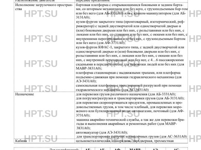 | Назначение | для перевозки грузов различного назначения (для АБ-3331А0); для погрузки/разгрузки и транспортировки грузов (для АБ-3131А0); для перевозки скоропортящихся продуктов, промышленных и продовольственных грузов, в том числе хлебный, для перевозки мороженого или бутилированной воды, автомагазин, почтовый (для АФ- 3731А0); машина аварийно-технической службы, а так же для перевозки бригады и выполнения аварийных и ремонтных работ (для МАВР- 3831А0); автоэвакуатор (для АЭ-3431А0); для транспортировки сыпучих и навалочных грузов (для АС-3631А0) |