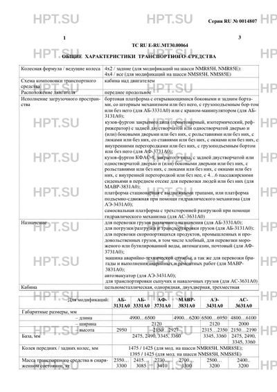 | Оборудование ТС | устройство вызова экстренных оперативных служб (для всех модификаций), система контроля устойчивости (для мод. на шасси NMR85?); тент, каркас тента, ворота (для АБ-3331А0); внутреннее освещение кузова, ступенька и поручень, фиксирующие элементы для удержания груза (для АФ-3731А0, МАВР-3831А0); холодильное оборудование (хладагент R-134a) (для АФ-3731А0); электроагрегат дизельный, штырь заземления, сварочное оборудование, набор слесарного инструмента, автономный отопитель We- basto Air Top Evo (в фургонах с пассажирскими сиденьями для перевозки людей), комплект встроенной мебели фирмы "Modul Sys- tem" (для МАВР-3831А0); два противооткатных устройства и две проушины для крепления эвакуируемого автомобиля, проблесковый маячок оранжевого цвета, фара освещения рабочей зоны (для АЭ-3431А0); тент, упор (для АС-3631А0); по заказу: спойлер на крыше кабины |