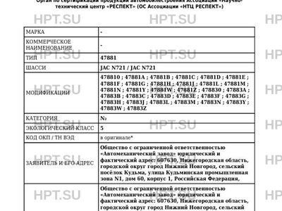 | Тип ТС | Транспортные средства не предназначены для перевозки опасных грузов. Транспортные средства типа 47881 относятся к модельному ряду 2766, согласно конструкторской документации завода-изготовителя. коммерческое наименование шасси / базовых транспортных средств - N75 коммерческое наименование шасси / базовых транспортных средств - N80 коммерческое наименование шасси / базовых транспортных средств - N90 коммерческое наименование шасси / базовых транспортных средств - N120. |