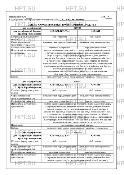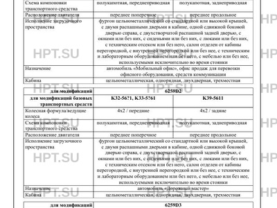 | Оборудование ТС | устройство вызова экстренных оперативных служб; электронная система контроля устойчивости (ESC); подиум или выдвижное приемное устройство - для 6259D7; стеллажи и шкафы для перевозки специального оборудования и инструмента - для 6259В1, 6259В2, 6259D2; 6259D5; аварийно-спасательное оборудование и инструмент, средства связи и освещения, средства индивидуальной защиты и оказания первой помощи - для 6259В1; оборудование, инструмент, верстаки, газовые баллоны - для 6259С3, 6259D2; оборудование, инструмент, верстаки, тумбы под оборудование, шкаф, рундук - для всех модификаций ТС; пожарно-техническое и аварийно-спасательное оборудование, средства связи и освещения, средства индивидуальной защиты и оказания первой помощи - для 6259А5, 6259В1, 6259В2, 6259В3, 6259С1, 6259С5; СГУ, специальный предупреждающий огонь синего цвета (для ТС оперативных служб) - для 6259А1, 6259А2, 6259А3, 6259А4, 6259А5, 6259А6, 6259А7, 6259В1, 6259В2, 6259В3, 6259С1, 6259С2, 6259С4; световая панель или проблесковый маячок желтого цвета (для ТС дорожных служб) - для 6259В2, 6259С3, 6259D2; лабораторное оборудование, лючки для вывода кабеля - для 6259А1, 6259А4, 6259А5, 6259С2, 6259С3, 6259С4, 6259С5; спальные места, комплект бытовой техники, оборудования и радиоаппаратуры, переговорное устройство, оборудование для автономного энергоснабжения - для 6259А2, 6259А3, 6259С1, 6259D4, 6259D6 по заказу: кондиционер; обогрев зеркал; аудиосистема; электростеклоподъемники; GPS оборудование; передние противотуманные фары; камера заднего вида; обогрев сидений; обогрев рулевого колеса; лабораторное и офисное оборудование; рундуки; вентиляционный люк, вытяжной вентилятор, внешний светильник над боковой или задней дверьми; электропривод сдвижной двери; дополнительные отопители салона; трансформируемые сиденья; сиденья, диваны, диваны на направляющих; стол; тумбы; парктроник; тент над боковой дверью; багажник на крышу; лестница на задней двери; подножки боковая и поручни; сигнализация; выдвижная платформа для генератора; подъемно - спусковой механизм для погрузки/ разгрузки генератора; наружный бортовой ввод 220В |