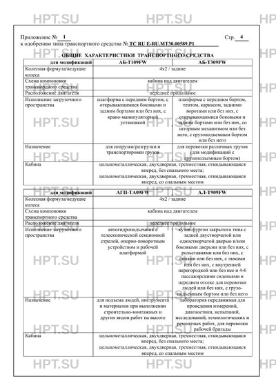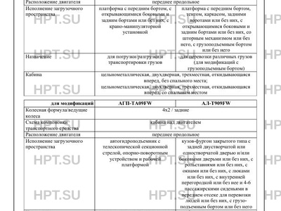 | Оборудование ТС | устройство вызова экстренных оперативных служб; кондиционер (хладагент R-134a); устройство ограничения максимальной скорости; дневные ходовые огни; тент, каркас тента, ворота (для АБТ309FW); внутреннее освещение кузова, ступенька и поручень, фиксирующие элементы для удержания груза, оборудования, инструмента (для АФ-Т709FW-01, АФ-Т709FW-02, МАВР-Т809FW- 01, МАВР-Т809FW-02, АЛ-Т909FW, ПМК-ТМ09FW); холодильная (хладагент R134A) и/или отопительная установка (для АФ-Т709FW- 02); электроагрегат дизельный или бензиновый, станция компрессорная, насосная установка, штырь заземления, сварочное оборудование, набор слесарного инструмента, лебедка, прожектор, антенна, багажник, лестница, домкраты, шанцевый инструмент, электроинструмент (для МАВР-Т809FW-01, МАВР-Т809FW-02); радиостанция, спасательное оборудование и инструмент, средства для оказания первой медицинской помощи, проблесковый маячок синего цвета (для МАВР-Т809FW-02); проблесковый маячок оранжевого цвета (для МАВР-Т809FW-01, АС-Т609FW, СКПТК09FW, АЭ-Т409FW, АЭ-Т009FW, АМ-Т509FW, АЛ-Т909FW); фара освещения рабочей зоны (для МАВР-Т809FW-01, МАВРТ809FW-02, СКП-ТК09FW, АЭ-Т409FW, АЭ-Т009FW, АМ-Т509FW, АЛ-Т909FW, ПМК-ТМ09FW); автономный отопитель (в фургонах с пассажирскими сиденьями), комплект встроенной мебели (для МАВР-Т809FW-01, МАВР-Т809FW-02, АЛ-Т909FW, ПМКТМ09FW); два противооткатных устройства и две проушины для крепления эвакуируемого автомобиля (для АЭ-Т409FW, АЭТ009FW); контрольно-измерительные приборы, диагностическое, испытательное, исследовательское и прочее специальное оборудование (для АЛ-Т909FW); специальное медицинское оборудование и инструмент (для ПМК-ТМ09FW); тент, упор (для АС -Т609FW); передние и задние аутригеры (для АБ-Т109FW, АЭТ009FW, АГП-ТА09FW); задние аутригеры (для АЭ-Т409FW, АМТ509FW) по заказу: спойлер на крыше кабины; дополнительные фонари заднего хода; инструментальный ящик |