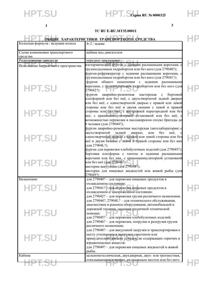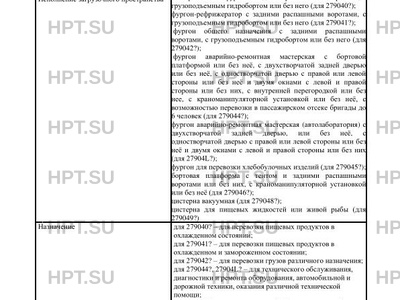 | Исполнение загрузочного пространства | изотермический фургон с задними распашными воротами, с грузоподъемным гидробортом или без него (для 279040?); фургон-рефрижератор с задними распашными воротами, с грузоподъемным гидробортом или без него (для 279041?); фургон общего назначения с задними распашными воротами, с грузоподъемным гидробортом или без него (для 279042?); фургон аварийно-ремонтная мастерская с бортовой платформой или без неѐ, с двухстворчатой задней дверью или без неѐ, с одностворчатой дверью с правой или левой стороны или без неѐ и двумя окнами с левой и правой стороны или без них, с внутренней перегородкой или без нее, с краноманипуляторной установкой или без неѐ, с возможностью перевозки в пассажирском отсеке бригады до 6 человек (для 279044?); фургон аварийно-ремонтная мастерская (автолаборатория) с двухстворчатой задней дверью, или без неѐ, с одностворчатой дверью с правой или левой стороны или без неѐ и двумя окнами с левой и правой стороны или без них (для 27904L?); фургон для перевозки хлебобулочных изделий (для 279045?); бортовая платформа с тентом и задними распашными воротами или без них, с краноманипуляторной установкой или без неѐ (для 279046?); цистерна вакуумная (для 279048?); цистерна для пищевых жидкостей или живой рыбы (для 279049?) |