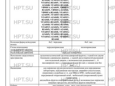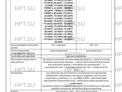 | Подвеска передняя | независимая, пружинная или с пневматическими упругими элементами, типа McPherson с гидравлическими телескопическими амортизаторами и стабилизатором поперечной устойчивости подушка безопасности водителя, передние электростеклоподъемники, система обеспечения курсовой устойчивости (ESP), устройство вызова экстренных оперативных служб, специальный предупреждающий огонь синего цвета СГУ, цветографическая раскраска по ГОСТ Р 50574 для автомобилей оперативных служб по заказу: кондиционер или климат-контроль, передняя подушка безопасности пассажира, боковые подушки безопасности, задние датчики парковки, откидной столик, автономный воздушный отопитель, система мониторинга давления воздуха в шинах, стационарные столы для оборудования, откидной/выдвижной столик, аварийно-спасательное оборудование, холодильное, морозильное оборудование, генератор, стеллажи, встроенные шкафы, отсеки, мониторы и компьютеры, стойки для оборудования, холодильная установка (рефрижератор), дополнительная теплоизоляция грузового отсека, багажник на крыше, лестница на крышу на задних распашных дверях, специальный предупреждающий огонь автожелтого цвета |