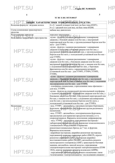| Дополнительная информация | Транспортные средства типа 5759P, модификаций 5759Р1, 5759Р2, 5759Р3, 5759Р4, 5759Р5, 5759Р6, 5759Р8, 5759Р9, 5759РА, коммерческое наименование ПРОМАВТО, изготавливаются на базе шасси марки КАМАЗ, тип 65207, категории N3G, модификаций 65207-S5, 65207-5Р, коммерческое наименование Т2640, модификации 65207-T5, коммерческое наименование Т2642; на базе шасси марки КАМАЗ, тип 65208, категории N3, модификации 65208-S5, коммерческое наименование Т2640. В случае несоответствия параметров транспортных средств значениям, установленным п.2.1 и п.2.2 Приложения № 5 к техническому регламенту Таможенного союза «О безопасности колесных транспортных средств», для передвижения транспортных средств по территории государств – членов Таможенного союза, необходимо оформление специального разрешения. |