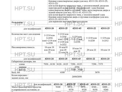 | Дополнительная информация | Транспортные средства марки НЕФАЗ типа 42111 модификаций 42111-24, 42111-25, 42111-43, изготавливаются на базе шасси марки КАМАЗ, типа 43502, модификации 43502-D5. Транспортные средства марки НЕФАЗ типа 42111 модификаций 42111-22, 42111-23, изготавливаются на базе шасси марки КАМАЗ, типа 43501, модификации 43501-G5. Транспортные средства типа 42111 не предназначены для коммерческих перевозок пассажиров. |