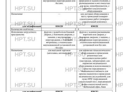 | Исполнение загрузочного пространства | фургон с задними распашными воротами или дверью, с боковыми дверьми, с окнами, с внутренними перегородками или без них платформа с откидными бортами, с каркасом и тентом или без них, или каркасный кузов с боковыми, прередним и задним отсеками, с размещенными в них емкостью для воды, пенообразователя, с аварийно-спасательным оборудованием фургон с задней и/или боковой дверью, с боковыми дверьми, с окнами, с внутренними перегородками, с боковыми витринами, с отопительновентиляционной установкой или без них фургон с задними распашными воротами или дверью, с боковыми дверьми, с окнами, с внутренними перегородками, с отопительно-вентиляционной установкой или без них специальная платформа с опорными устройствами, с тяговоцй лебедкой, с откидными бортами, с каркасорм и тентом, с задними распашными воротами или откидным трапом или без них специальная платформа, с тяговой лебедкой, с откидными бортами, с каркасорм и тентом, с задними распашными воротами или откидным трапом или выдвижными аппарелями или без них фургон с задними распашными воротами или дверью или откидным трапом, с боковыми дверьми, с окнами, с внутренними перегородками, с отопительно-вентиляционной установкой или без них платформа с откидными бортами, с каркасом и тентом, с задними распашными воротами или без них или фургон с задними распашными воротами или дверью, с боковыми дверьми, с окнами, с внутренними перегородками или без них фургон с задней дверью, с боковыми дверьми, с окнами, с внутренними перегородками, с отопительно-вентиляционной установкой или без них цистерна эллиптического сечения, одно или двух секционная фургон с боковыми, задними и передними дверьми или откидными панелями фургон с задними распашными воротами или дверью, с боковыми дверьми, с окнами, с внутренними перегородками, с холодильно-отопительной установкой или без них фургон с задними распашными воротами или дверью, с боковыми дверьми, с окнами, с внутренними перегородками, с холодильно-отопительной установкой или без них платформа с откидными бортами или высоким передним бортом, с каркасом и тентом, с задними распашными воротами или без них |