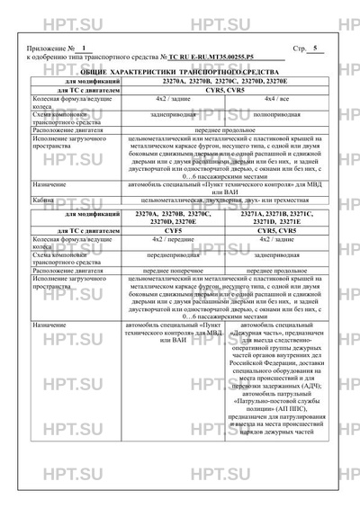 | Оборудование ТС | устройство вызова экстренных оперативных служб; подушка безопасности водителя стол, откидной стол, откидное сидение, холодильник, умывальник, сейф, лестница-стремянка, закрепленная на смотровой площадке; мебель (шкафы, антресоли, полки, тумбы, выдвижные ящики, стеллажи, рундуки), в том числе позволяющая размещать и перевозить: специальные полевые приборы и оборудование, оргтехнику, измерительные приборы и инструменты, механический инструмент, электроинструмент; шанцевый инструмент, осветительное оборудование, средства защиты и спасения, комплект инструментов и приборов, система пожаротушения; холодильное оборудование, лабораторное оборудование, газовая плита, биотуалет, раковина с подачей воды, электрочайник, свч-печь; электролебедка, компрессор электрический автомобильный, комплект резиновых ковриков в салон, огнетушитель, трос буксировочный, набор автомобилиста, домкрат, балонный ключ, буксировочная петля, полноразмерное запасное колесо; дополнительно для 2327DA: выдвижные механические опоры, переносные опоры, механическая мачта с лебедкой, добавочное колено на мачту, кабельный вывод на крыше, устройство подъема камеры, подготовка под установку бортового оборудования спутниковой навигационномониторинговой системы, мобильный аппаратнопрограммный комплекс фото видеофиксации нарушений ПДД, система кругового обзора; дополнительно для 2327DA: анализатор паров этанола, измеритель светопропускания тонированных стекол, квадрокоптер, чемодан инспектора ВАИ, одиночный комплект ЗИП, приборная стойка на виброопорах, дорожный знак с переносной опорой, конус дорожный, жилет сигнальный, монтажные элементы для развертывания и свертывания оборудования комплекса и инструмент, пластиковый бампер черного цвета, система мониторинга местоположения подвижных объектов с использованием спутниковых навигационных систем; дополнительно для 23271? (АДЧ, АП ДПС): аппаратно-программный комплекс видеонаблюдения (АПК ВН), оборудование системы ГЛОНАСС (КБО СНМС), маяки проблесковые дополнительные; дополнительно для 23271? (АДЧ): отсек для задержанных, клетка для собаки, ящик для бронежилетов, переносное осветительное устройство, автоматическая установка пожаротушения (АУП) автомобильный охранный комплекс (АОК); дополнительно для 23271? (АП ДПС): дополнительный источник электропитания или генератор, автомобильный охранный комплекс с системой блокировки дверей (АОК), мобильный АПК идентификации ТС по ГРЗ, осветительный комплекс места ДТП, АПК места фиксации мест ДТП, прибор для измерения этанола в выдыхаемом воздухе с печатным устройством (техническое средство идентификации для выявления паров этанола); дополнительно для 23271? (АП ДПС): прибор для обнаружения наркотических веществ, прибор обнаружения взрывчатых веществ, прибор измерения светопропускания автостекол, прибор выявления признаков подделки документов, укладка для оказания первой помощи, инвертор 12/220В, подъемный знак "Объезд препятствия"; дополнительно для 23273?, 23275? 23278?, 2327G?, 2327L?, 2327M?, 2327N?, 2327R?, 2327S?, 2327T?, 2327U?, 2327W?: гидроборт; дополнительно для 2327KB, 2327KD, 2327KE: автогидроподъемник; дополнительно для 23278B, 23278D, 23278E, 2327GB, 2327GD, 2327GE, 2327NB, 2327ND, 2327NE, 2327RB, 2327RD, 2327RE, 2327SB, 2327SD, 2327SE: краноманипуляторная установка (КМУ) |