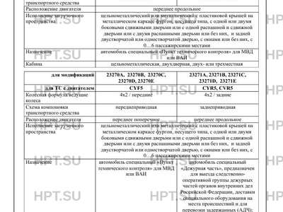 | Назначение | автомобиль специальный "Пункт технического контроля" для МВД или ВАИ Пункт технического контроля" для МВД или ВАИ автомобиль специальный "Пункт технического контроля" для МВД или ВАИ автомобиль специальный "Дежурная часть", предназначен для выезда следственнооперативной группы дежурных частей органов внутренних дел Российской Федерации, доставки специального оборудования на места происшествий и для перевозки задержанных (АДЧ); автомобиль патрульный "Патрульно-постовой службы полиции" (АП ППС), предназначен для патрулирования и выезда на места происшествий нарядов дежурных частей органов охраны правопорядка автомобиль патрульный дорожнопатрульной службы Госавтоинспекции, предназначенный для выезда на места осмотра дорожнотранспортных происшествий (АП ДПС) автомобиль специальный "Дежурная часть", предназначен для выезда следственно-оперативной группы дежурных частей органов внутренних дел Российской Федерации, доставки специального оборудования на места происшествий и для перевозки задержанных (АДЧ); автомобиль патрульный "Патрульно-постовой службы полиции" (АП ППС), предназначен для патрулирования и выезда на места происшествий нарядов дежурных частей органов охраны правопорядка автомобиль патрульный дорожно-патрульной службы Госавтоинспекции, предназначенный для выезда на места осмотра дорожно-транспортных происшествий (АП ДПС) рганов внутренних дел Российской Федерации, доставки специального оборудования на места происшествий и для перевозки з н для патрулирования и выезда на места происшествий нарядов дежурных частей органов охраны правопорядка предназначенный для выезда на места осмотра дорожно-транспортных происшествий (АП ДПС) автомобиль "Специальный" для перевозки трупов автомобиль "Специальный" для перевозки трупов с возможностью выполнения погрузо-разгрузочных работ (для вариантов исполнения с гидробортом) автомобиль "Специальный" для перевозки трупов автомобиль "Специальный" для перевозки трупов с возможностью выполнения погрузо-разгрузочных работ (для вариантов исполнения с гидробортом) автомобиль специальный "Пост весового контроля" для МВД автомобиль специальный "Пост весового контроля" для МВД с возможностью выполнения погрузо-разгрузочных работ (для вариантов исполнения с гидробортом) "Передвижная автолавка" Передвижная автолавка" "Передвижная автолавка" "Передвижная мастерская", предназначен для проведения ремонтных работ "Передвижная мастерская", предназначен для проведения ремонтных работ с возможностью выполнения погрузо-разгрузочных работ (для "Передвижная мастерская", предназначен для проведения ремонтных работ с возможностью выполнения погрузо-разгрузочных работ (для вариантов исполнения с гидробортом) вариантов исполнения с КМУ) "Передвижная мастерская", предназначен для проведения ремонтных работ "Передвижная мастерская", предназначен для проведения ремонтных работ с возможностью выполнения погрузо-разгрузочных работ (для вариантов исполнения с гидробортом) "Передвижная мастерская", предназначен для проведения ремонтных работ с возможностью выполнения погрузо-разгрузочных работ (для вариантов исполнения с КМУ) "Передвижная мастерская", предназначен для проведения ремонтных работ "Передвижная мастерская", предназначен для проведения "Пере