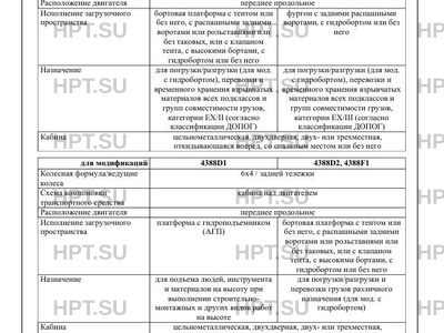 | Оборудование ТС | устройство вызова экстренных оперативных служб с функцией автоматического срабатывания при опрокидывании, устройство ограничения максимальной скорости (функцию устройства ограничения максимальной скорости выполняет электронный блок управления двигателем); оборудование, предусмотренное пунктом 2.5 Приложения № 6 ТР ТС 018/2011 (для автомобилей, предназначенных для перевозки опасных грузов) по заказу: предпусковой подогреватель, кондиционер, передние противотуманные фары (для модификаций на базе ТС/шасси, имеющих официальное утверждение на основании Правил ООН № 48-05), устройства и элементы конструкции для обеспечения возможности перевозки опасных грузов (кроме мод. 4388D0, 4388F3, 4388D0-10); спутниковое навигационное оборудование, тахограф, лебедка, высокие борта, коробка отбора мощности, краноманипуляторные установки, инструментальный ящик, гидроборта; для всех модификаций (кроме мод. 4388D0, 4388F3, 4388D0-10): дополнительный выключатель аккумуляторных батарей АКБ, ящик под песок, цепь заземления, защита глушителя, защита бензобака, искрогаситель, знаки опасности; холодильная установка, каркасы тентов различной формы с распашными задними воротами или рольставнями или клапан тента, предупреждающий огонь автожелтого цвета, дорожные знаки, обтекатели крыши кабины |