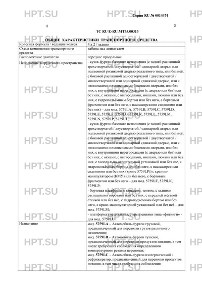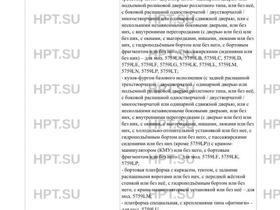 | Исполнение загрузочного пространства | кузов-фургон базового исполнения (с задней распашной трехстворчатой / двустворчатой / одинарной дверью или подъемной роликовой дверью роллетного типа, или без неё, с боковой распашной одностворчатой / двустворчатой / многостворчатой или одинарной сдвижной дверью, или с несколькими независимыми боковыми дверьми, или без них, с внутренними перегородками (с дверью или без) или без них, с окнами, с выгородками, нишами, люками или без них, с гидроподъёмным бортом или без него, с бортовым фрагментом или без него, с пассажирскими сидениями или без них) - для мод. 5759LА, 5759LВ, 5759LС, 5759LD, 5759LЕ, 5759LF, 5759LG, 5759LК, 5759LL, 5759LМ, 5759LN, 5759LР, 5759LТ; - кузов-фургон базового исполнения (с задней распашной трехстворчатой / двустворчатой / одинарной дверью или подъемной роликовой дверью роллетного типа, или без неё, с боковой распашной одностворчатой / двустворчатой / многостворчатой или одинарной сдвижной дверью, или с несколькими независимыми боковыми дверьми, или без них, с внутренними перегородками (с дверью или без) или без них, с окнами, с выгородками, нишами, люками или без них, с холодильно-отопительной установкой или без нее, с гидроподъёмным бортом или без него, с пассажирскими сидениями или без них (кроме 5759LP)) с краномманипулятором (КМУ) или без него, с бортовым фрагментом или без него - для мод. 5759LF, 5759LК, 5759LР; - бортовая платформа с каркасом, тентом, с задними распашными воротами или без них, с передней жёсткой стенкой или без неё, с гидроподъёмным бортом или без него, с крано-манипуляторной установкой или без неё - для мод. 5759LМ; - платформа специальная, с креплениями типа «фитинги» - для мод. 5759LU. |