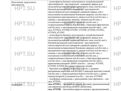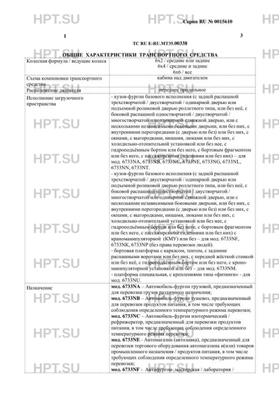 | Дополнительная информация | Транспортные средства типа 6733N, модификаций 6733NA, 6733NB, 6733NC, 6733NE, 6733NF, 6733NG, 6733NK, 6733NL, 6733NM, 6733NN, 6733NP, 6733NT, 6733NU, коммерческое наименование ПРОМАВТО, изготавливаются на базе шасси марки Mercedes-Benz, типа 963, модификаций 2627, 2630, 2632, 2635, 2633, 2636, 2640, 2643, 2646, 2642, 2645, 2648, 2651, 2653, 2652, 2658, 2663, 3333, 3336, 3340, 3343, 3346, 3342, 3345, 3348, 3351, 3353, 3352, 3358, 3363, 3333A, 3336A, 3340A, 3343A, 3346A, 3342A, 3345A, 3348A, 3351A, 3353A, 3352A, 2527L, 2530L, 2532L, 2535L, 2533L, 2536L, 2540L, 2543L, 2546L, 2542L, 2545L, 2548L, 2551L, 2553L, 2552L, 2558L, 2563L, 2627L, 2630L, 2632L, 2635L, 2633L, 2636L, 2640L, 2643L, 2646L, 2642L, 2645L, 2648L, 2651L, 2653L, 2652L, 2658L, 2663L, 3333L, 3336L, 3340L, 3343L, 3346L, 3342L, 3345L, 3348L, 3351L, 3353L, 3352L, 3358L, 3363L, 2627S, 2630S, 2632S, 2635S, 2633S, 2636S, 2640S, 2643S, 2646S, 2642S, 2645S, 2648S, 2651S, 2653S, 2652S, 2658S, 2663S, 3333S, 3336S, 3340S, 3343S, 3346S, 3342S, 3345S, 3348S, 3351S, 3353S, 3352S, 3358S, 3363S, 2427LS, 2430LS, 2432LS, 2435LS, 2433LS, 2436LS, 2440LS, 2443LS, 2446LS, 2442LS, 2445LS, 2448LS, 2451LS, 2453LS, 2452LS, 2458LS, 2463LS, 2527LS, 2530LS, 2532LS, 2535LS, 2533LS, 2536LS, 2540LS, 2543LS, 2546LS, 2542LS, 2545LS, 2548LS, 2551LS, 2553LS, 2552LS, 2558LS, 2563LS, 2627LS, 2630LS, 2632LS, 2635LS, 2633LS, 2636LS, 2640LS, 2643LS, 2646LS, 2642LS, 2645LS, 2648LS, 2651LS, 2653LS, 2652LS, 2658LS, 2663LS, 3333LS, 3336LS, 3340LS, 3343LS, 3346LS, 3342LS, 3345LS, 3348LS, 3351LS, 3353LS, 3352LS, 3358LS, 3363LS, 3333AS, 3336AS, 3340AS, 3343AS, 3346AS, 3342AS, 3345AS, 3348AS, 3351AS, 3353AS, 3352AS, 3358AS, 3363AS, 2627K, 2630K, 2632K, 2635K, 2633K, 2636K, 2640K, 2643K, 2646K, 2642K, 2645K, 2648K, 2651K, 2653K, 2652K, 2658K, 2663K, 2627LK, 2630LK, 2632LK, 2635LK, 2633LK, 2636LK, 2640LK, 2643LK, 2646LK, 2642LK, 2645LK, 2648LK, 2651LK, 2653LK, 2652LK, 2658LK, 2663LK, 3332K, 3333K, 3336K, 3340K, 3343K, 3346K, 3342K, 3345K, 3348K, 3351K, 3353K, 3352K, 3358K, 3363K, 3333LK, 3336LK, 3340LK, 3343LK, 3346LK, 3342LK, 3345LK, 3348LK, 3351LK, 3353LK, 3352LK, 3358LK, 3363LK, 3333AK, 3336AK, 3340AK, 3343AK, 3346AK, 3342AK, 3345AK, 3348AK, 3351AK, 3353AK, 3352AK, 3358AK, 3363AK, 2627B, 2630B, 2632B, 2635B, 2633B, 2636B, 2640B, 2643B, 2646B, 2642B, 2645B, 2648B, 2651B, 2653B, 2627LB, 2630LB, 2632LB, 2635LB, 2633LB, 2636LB, 2640LB, 2643LB, 2646LB, 2642LB, 2645LB, 2648LB, 2651LB, 2653LB, 3332B, 3333B, 3336B, 3340B, 3343B, 3346B, 3342B, 3345B, 3348B, 3351B, 3353B, 3333LB, 3336LB, 3340LB, 3343LB, 3346LB, 3342LB, 3345LB, 3348LB, 3351LB, 3353LB, коммерческое наименование Mercedes-Benz Antos, Mercedes-Benz Actros, Mercedes-Benz Actros SLT, Mercedes-Benz Actros Semi SLT, Mercedes-Benz Arocs, Mercedes-Benz Arocs SLT, Mercedes-Benz Arocs Semi SLT. Перевозка пассажиров в кузове-фургоне разрешена только для модификаций 6733NF, 6733NG, 6733NК, 6733NL, 6733NN, 6733NТ, с общим числом пассажирских мест не более восьми. В случае превышения параметров, указанных в пунктах 2.1 и 2.2 Приложения № 5 к техническому регламенту Таможенного союза «О безопасности колесных транспортных средств», для передвижения автомобилей типа 6733N по территории государств-членов Таможенного союза необходимо оформление специального разрешения. |