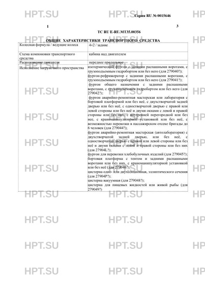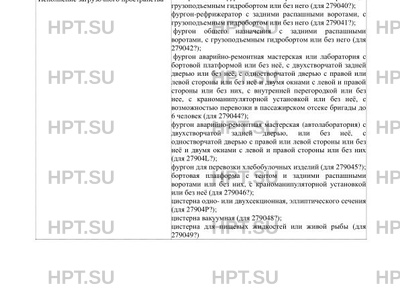 | Назначение | для 279040? - для перевозки пищевых продуктов в охлажденном состоянии; для 279041? - для перевозки пищевых продуктов в охлажденном и замороженном состоянии; для 279042? - для перевозки грузов различного назначения; для 279044?, 27904L? - для технического обслуживания, диагностики и ремонта оборудования, автомобильной и дорожной техники, оказания различной технической помощи; для 279045? - для перевозки хлебобулочных изделий; для 279046? - для перевозки, погрузки и разгрузки грузов различного назначения; для 27904Р? - для транспортирования, кратковременного хранения и механизированной заправки различной техники нефтепродуктами плотностью до 0,86 т/м3 с одновременным учетом объема выдаваемого топлива, а также для перекачки топлива из одной емкости в другую, минуя собственную; для 279048? - для вакуумной загрузки и транспортировки к месту утилизации и выгрузки самотеком или принудительно жидких отходов, не содержащих горючих и взрывоопасных веществ; для 279049? - для перевозки пищевых жидкостей и живой рыбы. |