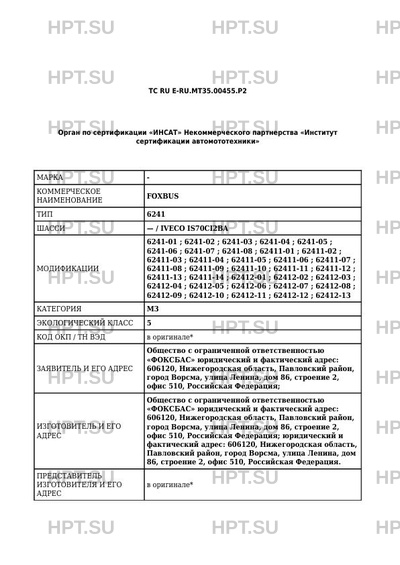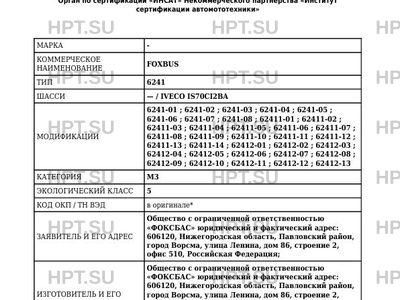 | Оборудование ТС | зеркала заднего вида с электроприводом и электрообогревом, обогрев топливного бака, иммобилайзер, дистанционный выключатель аккумуляторной батареи, сиденье IVECO, цифровой тахограф, устройство вызова экстренных оперативных служб "Радиостанция абонентская возимая "Гранит-Навигатор 6.18", пассажирские сиденья тип "маршрутка", пассажирские сиденья повышенной комфортности; солнцезащитная шторка водителя, электроприводы дверей, фильтровентиляционная установка (ФВУ), подсветка (подиумов, багажных полок, багажных отсеков, ступеней служебных выходов), кронштейн запасного колеса, запасное колесо, аппарель ручная, опорная панель, кнопка вызова водителя внешняя (для модификации 6241-01, 6241-02, 6241-03, 6241-04, 6241-05, 6241- 06, 6241-07, 6241-08); предпусковой догреватель двигателя, подиумы под пассажирские сиденья для модификации 62412-01, 62412-02, 62412-03, 62412-04, 62412-05, 62412-06, 62412-07, 62412-08, 62412- 09, 62412-10, 62412-11, 62412-12, 62412-13 по заказу: круиз-контроль, адаптивный круиз-контроль, бортовой компьютер, аппаратура спутниковой навигации в составе системы IVECONNECT, дополнительные зависимые отопители салона, дополнительные независимые отопители салона, кондиционер для салона (хладагент R134А), кондиционер для водителя (хладагент R134A), центральная блокировка дверей, подушка безопасности водителя, электропривод замков дверей, сдвижная (тентовая) крыша и боковые тентовые шторки (для модификации 62411-11, 62411-12, 62411-13, 62411-14); подиумы под пассажирские сиденья (для |