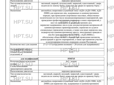 Назначение автомобиль оперативно-служебный типа "АДЗ" (АДЗ-15ИН, АДЗ- 20ИН) для перевозки лиц, задержанных в административном порядке, при проведении спортивных массовых, общественнополитических (в том числе несанкционированных) мероприятий, при проведении профилактических, режимных и иных мероприятий, с мест их проведения в органы внутренних дел; перевозки задержанных лиц в суды для рассмотрения материалов об административных правонарушениях; перевозки из судов в специальные учреждения полиции, а также для иных перевозок лиц, подвергнутых административному аресту, иностранных граждан и лиц без гражданства ("АДЗ-15ИН", "АДЗ-20ИН"); обеспечение общественного порядка при проведении митингов, демонстраций и других мероприятий, а также при принятии участия в контртеррористических операциях силами Росгвардии автомобиль оперативно-служебный типа "АДЗ" (АДЗ-15ИН, АДЗ- 20ИН) для перевозки лиц, задержанных в административном порядке, при проведении спортивных массовых, общественнополитических (в том числе несанкционированных) мероприятий, при проведении профилактических, режимных и иных мероприятий, с мест их проведения в органы внутренних дел; перевозки задержанных лиц в суды для рассмотрения материалов об административных правонарушениях; перевозки из судов в специальные учреждения полиции, а также для иных перевозок лиц, подвергнутых административному аресту, иностранных граждан и лиц без гражданства ("АДЗ-15ИН", "АДЗ-20ИН"); обеспечение общественного порядка при проведении митингов демонстраций и других мероприятий, а также при принятии участия в контртеррористических операциях силами Росгвардии автомобиль оперативно-служебный типа "АДЗ" (АДЗ-15ИН, АДЗ- 20ИН) для перевозки лиц, задержанных в административном порядке, при проведении спортивных массовых, общественнополитических (в том числе несанкционированных) мероприятий, при проведении профилактических, режимных и иных мероприятий, с мест их проведения в органы внутренних дел; перевозки задержанных лиц в суды для рассмотрения материалов об административных правонарушениях; перевозки из судов в специальные учреждения полиции, а также для иных перевозок лиц, подвергнутых административному аресту, иностранных граждан и лиц без гражданства ("АДЗ-15ИН", "АДЗ-20ИН"); обеспечение общественного порядка при проведении митингов, демонстраций и других мероприятий, а также при принятии участия в контртеррористических операциях силами Росгвардии автомобиль оперативно-служебный типа "АЗ" для перевозки осужденных, подозреваемых и обвиняемых в совершении преступлений автомобиль оперативно-служебный типа АТНП для транспортирования подразделений полиции для выполнения задач по охране общественного порядка и обеспечении общественной безопасности