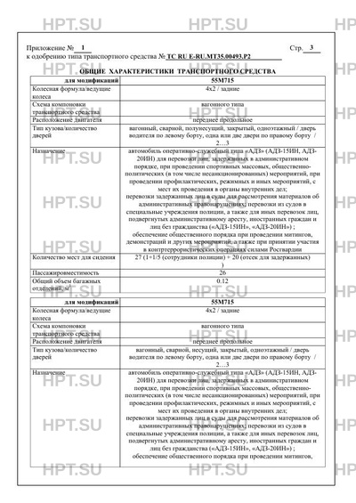 Оборудование ТС проблесковые маячки синего цвета, СГУ (спецтранспорт МВД, Росгвардии); ремень безопасности на местах для сидения водителя и переднего пассажира; устройство вызова экстренных оперативных служб; предпусковой подогреватель; убирающаяся ступенька у передней служебной двери; система электронного контроля устойчивости (для автобусов классов III и В); дневные ходовые огни по заказу: противотуманные фары; тахограф; сиденье водителя повышенной комфортности; стекла с уменьшенным светопропусканием (кроме ветровых и передних боковых окон); стеклопакеты; подготовка под установку аудио-видео аппаратуры; система видеонаблюдения; кондиционер; система пожаротушения; вставки безопасности в колеса для обеспечения движения при спущенных шинах, радиостанции стационарные и переносные, навигационные системы, в том числе ГЛОНАСС, системы пожаротушения моторного и/или других отсеков, система приточноОдобрение типа транспортного средства № Стр. вытяжной вентиляции, автономного отопления, средства освещения, средства индивидуальной защиты и оказания первой помощи; биотуалет, системы кондиционирования, дополнительное технологическое специальное оборудование, в том числе генераторы, стеллажи, ящики, полки, шкафы, столы, рундуки, оборудование для автономного энергоснабжения, переговорные устройства, средства связи и оповещения, дополнительное силовое электрооборудование, акустические системы, аудио -видеооборудование, технологическая мебель, защитные решетки на окна; откидное сиденье, используемое только во время стоянки (перевозка пассажиров на данном сиденье запрещена); система электронного контроля устойчивости (для автобусов классов А)