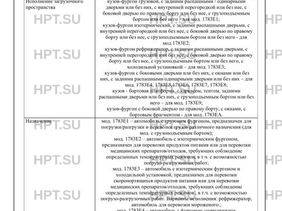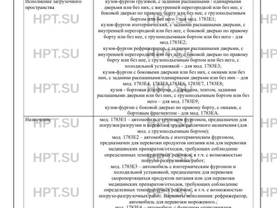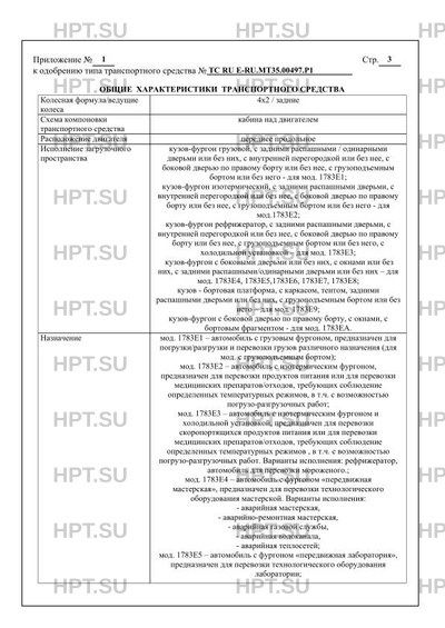 Назначение мод. 1783E1 - автомобиль с грузовым фургоном, предназначен для погрузки/разгрузки и перевозки грузов различного назначения (для мод. с грузоподъемным бортом); мод. 1783E2 - автомобиль с изотермическим фургоном, предназначен для перевозки продуктов питания или для перевозки медицинских препаратов/отходов, требующих соблюдение определенных температурных режимов, в т.ч. с возможностью погрузо-разгрузочных работ; мод. 1783E3 - автомобиль с изотермическим фургоном и холодильной установкой, предназначен для перевозки скоропортящихся продуктов питания или для перевозки медицинских препаратов/отходов, требующих соблюдение определенных температурных режимов , в т.ч. с возможностью погрузо-разгрузочных работ. Варианты исполнения: рефрижератор, автомобиль для перевозки мороженого.; мод. 1783E4 - автомобиль с фургоном "передвижная мастерская", предназначен для перевозки технологического оборудования мастерской. Варианты исполнения: - аварийная мастерская, - аварийно-ремонтная мастерская, - аварийная газовой службы, - аварийная водоканала, - аварийная теплосетей; мод. 1783E5 - автомобиль с фургоном "передвижная лаборатория", предназначен для перевозки технологического оборудования лаборатории Варианты исполнения: - жилой модуль, - экологическая лаборатория, - лаборатория телемеханики, - лаборатория электрохимзащиты, - лаборатория исследования скважин, - лаборатория неразрушающего контроля, - электроизмерительная лаборатория; мод. 1783E6 - автомобиль с фургоном специальный, предназначен для перевозки оборудования оперативных служб МВД; мод. 1783E7 - автомобиль с фургоном специальный, предназначен для перевозки аварийно-спасательного оборудования МЧС; мод. 1783E8 - автомобиль с фургоном "передвижной медицинский комплекс", предназначен для перевозки медицинского оборудования; мод. 1783E9 - автомобиль с бортовой платформой, предназначен для погрузки/разгрузки и перевозки грузов различного назначения (для мод. с грузоподъемным бортом); мод. 1783EА - автомобиль с фургоном и бортовым фрагментом, предназначен для перевозки технологического оборудования (ПАРМ)