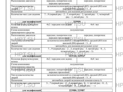 | Тип ТС | Транспортные средства изготавливаются на базе транспортных средств модификаций: SYN1E, SYN1Z При оформлении ОТТС применяется уровень требований в соответствии со сноской 16 к таблице требований Приложения №2 к техническому регламенту Таможенного союза «О безопасности колесных транспортных средств» с учетом использования базового транспортного средства категории N1. К экологическому классу 5 относятся транспортные средства с двигателями DAUA, DAUB, DASC. К экологическому классу 6 относятся транспортные средства с двигателями DAUA. Отнесение транспортных средств к определенному экологическому классу подтверждается кодом производителя базового транспортного средства (Pr. Code), который указывается на наклейке, расположенной в правой части открытого вещевого отсека на стороне переднего пассажира и в руководстве по эксплуатации. Для 5 экологического класса предусмотрены следующие коды производителя (Pr. Code): 7MJ, 7MF. Для 6 экологического класса предусмотрены следующие коды производителя (Pr. Code): 7MM. Тип двигателя транспортного средства определяется по обозначению на блоке двигателя. Для типа двигателя DAUA обозначение на блоке цилиндров DAU. Для типа двигателя DAUB обозначение на блоке цилиндров DAU. Для типа двигателя DASC обозначение на блоке цилиндров DAS. Для транспортных средств типа 2239 модификаций 2239А0, 2239А7, 2239В0, 2239В7, 2239C0, 2239C7 предусмотрена перевозка пассажиров на носилках в медицинском отсеке в количестве от 1 до 2. |