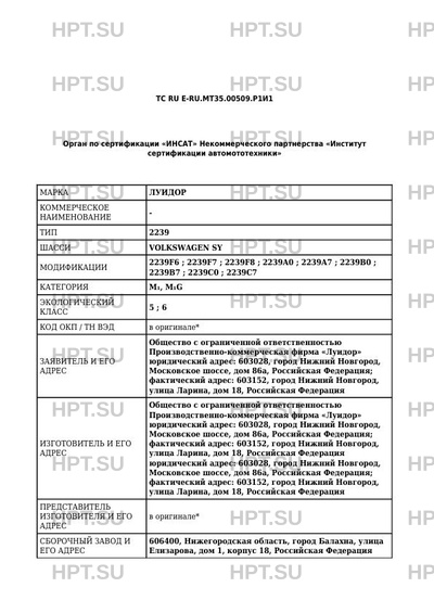 | Базовое ТС / Шасси | VOLKSWAGEN SY |