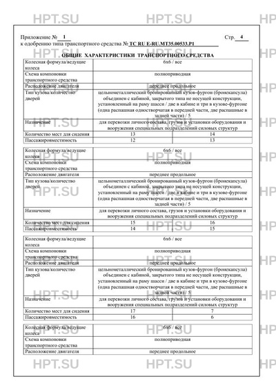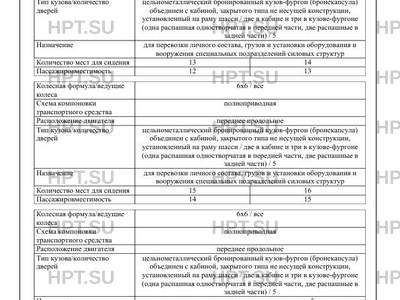 | Оборудование ТС | централизованная система регулирования давления воздуха в шинах, броневая защита кабины и кузова-фургона (бронекузова); защита днища бронекузова от фугасного воздействия безоболочных ВУ с массой в ТЭ до 3 кг (при наземном подрыве под его центром) и от поражающих факторов гранат типа Ф-1 и РГО, броневая защита крыши кабины и кузова-фургона, бронированные двери с ограничителями открывания; опорные ролики для разгрузки замкового механизма дверей с механическими задвижками (ригельный замок), бронированные стекла кабины и бронекузова, бойницы в кабине и бронекузове, дифференцированная защита топливного бака, броневая защита по периметру моторного отсека; броневая защита аккумуляторных батарей, бронированный люк в крыше кабины, 1-4 аварийно-вентиляционных люка в крыше бронекузова, устройство удаления пороховых газов (УПГ), система вентиляции в бронекузове, антиосколочная защита (АОЗ) кабины и бронекузова; дистанционная система пожаротушения моторного отсека, отопители бронекузова, аварийная кнопка отключения "массы", переговорное устройство, огнетушители, дополнительное оборудование в соответствии с ТУ 4523-007-95206603-2013 по заказу: кондиционер, дифференцированная защита топливного бака со специальной защитой от выплеска топлива при подрыве, с системой разгрузки (СЛСР); система вентиляции в бронекузове (ФВУ), антискользящее покрытие на крыше бронекузова, СОЖД, тент, держатель запасного колеса |