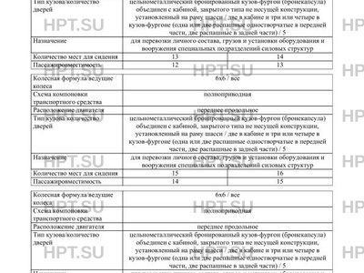 | Оборудование ТС | централизованная система регулирования давления воздуха в шинах, броневая защита кабины и кузова-фургона (бронекузова); защита днища бронекузова от фугасного воздействия безоболочных ВУ с массой в ТЭ до 3 кг (при наземном подрыве под его центром) и от поражающих факторов гранат типа Ф-1 и РГО, броневая защита крыши кабины и кузова-фургона, бронированные двери с ограничителями открывания; опорные ролики для разгрузки замкового механизма две-рей с механическими задвижками (ригельный замок), бронированные стекла кабины и бронекузова, бойницы в кабине и бронекузове, дифференцированная защита топливного бака, броневая защита по периметру моторного отсека; броневая защита аккумуляторных батарей, бронированный люк в крыше кабины, 1-4 аварийно-вентиляционных люка в крыше бронекузова, устройство удаления пороховых газов (УПГ), система вентиляции в бронекузове, антиосколочная защита (АОЗ) кабины и бронекузова; дистанционная система пожаротушения моторного отсека, отопители бронекузова, аварийная кнопка отключения "массы", переговорное устройство, огнетушители, до-полнительное оборудование в соответствии с ТУ 4523-007-95206603-2013 по заказу: кондиционер, дифференцированная защита топливного бака со специальной защитой от выплеска топлива при подрыве, с системой разгрузки (СЛСР); система вентиляции в бронекузове (ФВУ), антискользящее покрытие на крыше бронекузова, СОЖД, тент, держатель запасного колеса |