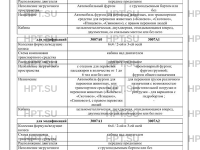 | Назначение | Автомобиль фургон для перевозки животных, или транспортное средство для перевозки животных («Коневоз», «Скотовоз», «Птицевоз», «Свиновоз»), с правом перевозки людей перевозки животных («Коневоз», «Скотовоз», «Птицевоз», «Свиновоз»), с правом перевозки людей Автомобиль фургон для перевозки животных, или транспортное средство для перевозки животных («Коневоз», «Скотовоз», «Птицевоз», «Свиновоз»), с правом перевозки людей для перевозки грузов различного назначения с возможностью самостоятельной погрузки и разгрузки - для вариантов с гидробортом для перевозки грузов различного назначения с возможностью самостоятельной погрузки и разгрузки - для вариантов с гидробортом; - для перевозки скоропортящихся продуктов («фургон-сэндвич», «рефрижератор») для перевозки скоропортящихся продуктов («фургон-сэндвич», «рефрижератор») Автомобильный фургон передвижная мастерская/лаборатория; Варианты исполнения и комплектации; мастерская аварийновосстановительных работ (МАВР); агрегат наземного ремонта водоводов (АВМ); автомобиль-фургон для перевозки специального оборудования; автомобиль-фургон для испытательной установки; аварийная водопроводная (водопроводно-канализационная) мастерская (АВМ); аварийно-ремонтная мастерская теплосетей и котельных (АРТКМ); передвижная аварийноремонтная мастерская (ПАРМ); автомобиль-фургон бригадный; машина вахтовая для ремонтных бригад; измерительная лаборатория; диагностическая лаборатория; лаборатория неразрушающего контроля; рентгеновская лаборатория; экологическая лаборатория; лаборатория высоковольтных испытаний с правом перевозки до 6 человек Автомобильный фургон передвижная мастерская/лаборатория; Варианты исполнения и комплектации; агрегат наземного ремонта водоводов (АВМ); аварийная водопроводная (водопроводно-канализационная) мастерская (АВМ); аварийно-ремонтная мастерская теплосетей и котельных (АРТКМ); передвижная аварийноремонтная мастерская (ПАРМ); автомобиль-фургон бригадный; машина вахтовая для ремонтных бригад; измерительная лаборатория; диагностическая лаборатория; лаборатория неразрушающего контроля; рентгеновская лаборатория; экологическая лаборатория; лаборатория высоковольтных испытаний с правом перевозки до 6 человек мастерская аварийновосстановительных работ (МАВР); автомобиль-фургон для перевозки специального оборудования; автомобиль-фургон для испытательной установки Автомобиль для выездной торговли (автолавка) для выездной торговли (автолавка) мастерская аварийновосстановительных работ (МАВР); автомобиль-фургон для перевозки специального оборудования; автомобиль-фургон для испытательной установки; аварийная водопроводная (водопроводноканализационная) мастерская (АВМ); автомобиль бригадный аварийная водопроводная (водопроводноканализационная) мастерская (АВМ); автомобиль бригадный мастерская аварийновосстановительных работ (МАВР); автомобиль-фургон для перевозки специального оборудования; автомобиль-фургон для испытательной установки; аварийная водопроводная (водопроводноканализационная) мастерская (АВМ); автомобиль бригадный для перевозки грузов различного назначения с возможностью самостоятельной погрузки и разгрузки - для вариантов с гидробортом и/или КМУ («Грузовой», «Бортовой», «Грузовой с КМУ», «Бортовой с КМУ», 