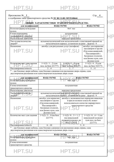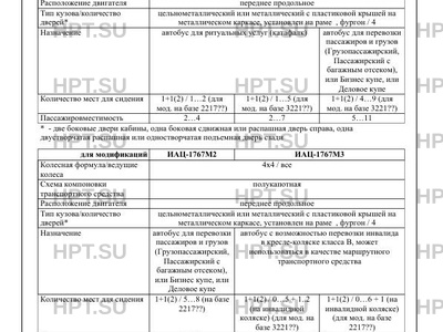 | Тип ТС | Транспортные средства изготавливаются на базе транспортных средств модификаций: 32217, 322173, 322171, 221757, 221775, 221777, 221717, 221772, 221727 Транспортные средства изготавливаются на базе шасси модификаций: 32217, 322173, 322171, 322174, 221757, 221775, 22177, 221717, 221772, 221727 Транспортные средства типа ИАЦ-1767М модификации ИАЦ-1767М1, ИАЦ-1767М2, ИАЦ-1767М3, ИАЦ-1767М4, ИАЦ-1767М6, ИАЦ-1767М8, ИАЦ-1767М9 относятся к классу В и предназначены для перевозки только сидящих пассажиров (абзац четвёртый пункта 2.2 приложения № 1 к техническому регламенту Таможенного союза «О безопасности колёсных транспортных средств»). Транспортные средства типа ИАЦ-1767М модификации ИАЦ-1767М5 - автомобили скорой медицинской помощи - относятся к классу В и предназначены для перевозки только сидящих пассажиров (абзац четвёртый пункта 2.2 приложения № 1 к техническому регламенту Таможенного союза «О безопасности колёсных транспортных средств»), а также пассажиров на носилках. Сборочный завод - Акционерное общество «Научно-производственное объединение «СПЛАВ» имени А.Н. Ганичева - только для транспортных средств типа ИАЦ-1767М модификации ИАЦ-1767М5. Транспортные средства модификаций ИАЦ-1767М1, ИАЦ-1767М2, ИАЦ-1767М3, ИАЦ-1767М5, ИАЦ-1767М6, ИАЦ-1767М8, ИАЦ-1767М9 с уменьшенным числом посадочных мест не предназначены для коммерческой перевозки пассажиров. Транспортные средства модификаций ИАЦ-1767М3, ИАЦ-1767М8 могут использоваться для коммерческой перевозки пассажиров. |