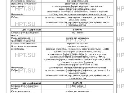 | Оборудование ТС | устройство вызова экстренных оперативных служб; специальный предупреждающий огонь автожелтого цвета (для для SMA600, SMA601, SMA602, SMA603, SMA609, SMA60C); коробка отбора мощности (для мод. с гидравлическим оборудованием) по заказу: кондиционер; аудиосистема; антенна; система поддержания скорости движения (круиз-контроль); устройство ограничения максимальной скорости (функцию устройства ограничения скорости выполняет блок управления двигателем); обтекатель на кабину (для модификаций SMA604, SMA605, SMA606, SMA607, SMA608, SMA60A, SMA60B, SMA60E); предпусковой подогреватель двигателя; GPS оборудование; коробка отбора мощности; зеркала заднего вида с обогревом; электрические стеклоподъемники; холодильная установка; гидроподъемное оборудование; гидроподъемный борт; обтекатель на фургон; каркас тента; тент; сдвижная крыша; сдвижная штора; ворота; лебедка; тахограф; траверса; колесные захваты; грейферы; захваты; грузовая люлька; краноманипуляторная установка (КМУ); инструментальный ящик; механизм частичной погрузки (МЧП); автономный отопитель кабины; аппарели; карманы для хранения аппарелей; противоугонная система; система видеонаблюдения; оборудование или подготовка для оборудования для контроля соблюдения водителем режимов движения, труда и отдыха; автономный жидкостной подогреватель; дополнительный подогреватель двигателя и кабины; бортовая информационномультимедийная система; система помощи при парковке; технологическое оборудование автомастерской; окна (для мод. SMA60E); передние противотуманные фары |