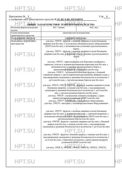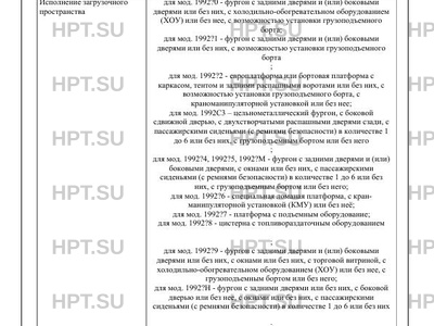| Исполнение загрузочного пространства | для мод. 1992?0 - фургон с задними дверями и (или) боковыми дверями или без них, с холодильно-обогревательном оборудованием (ХОУ) или без нее, c возможностью установки грузоподъемного борта; для мод. 1992?1 - фургон с задними дверями и (или) боковыми дверями или без них, c возможностью установки грузоподъемного борта; для мод. 1992?2 - европлатформа или бортовая платформа с каркасом, тентом и задними распашными воротами или без них, c возможностью установки грузоподъемного борта, с краноманипуляторной установкой или без нее; для мод. 1992С3 - цельнометаллический фургон, с боковой сдвижной дверью, с двухстворчатыми распашными дверями сзади, с пассажирскими сиденьями (с ремнями безопасности) в количестве 1 до 6 или без них, с грузоподъемным бортом или без него; для мод. 1992?4, 1992?5, 1992?M - фургон с задними дверями и (или) боковыми дверями, с окнами или без них, с пассажирскими сиденьями (с ремнями безопасности) в количестве 1 до 6 или без них, c грузоподъемным бортом или без него; для мод. 1992?6 - специальная ломаная платформа, с кранманипуляторной установкой (КМУ) или без неё; для мод. 1992?7 - платформа с подъемным оборудование; для мод. 1992?8 - цистерна с топливораздаточным оборудованием; для мод. 1992?9 - фургон с задними дверями и (или) боковыми дверями или без них, с окнами или без них, с торговой витриной, с холодильно-обогревательном оборудованием (ХОУ) или без нее, c грузоподъемным бортом или без него; для мод. 1992?H - фургон с задними дверями или без них, c боковой дверью или без нее, с окнами или без них, с пассажирскими сиденьями (с ремнями безопасности) в количестве 1 до 6 или без них; для мод. 1992?F - фургон с боковой дверью, с окнами или без них, с пассажирскими сиденьями (с ремнями безопасности) в количестве 1 до 6 или без них, с бортовым сегментом, с кран-манипуляторной установкой (КМУ) или без неё; для мод. 1992СA, 1992СB, 1992СC, 1992СD, 1992СE, 1992СG, одильно-обогревательном оборудованием (ХОУ) или без нее, c возможностью установки грузоподъемного борта; овыми дверями или без них, c возможностью установки грузоподъемного борта; воротами или без них, c возможностью установки грузоподъемного борта, с краноманипуляторной установкой или без нее; ями сзади, с пассажирскими сиденьями (с ремнями безопасности) в количестве 1 до 6 или без них, с грузоподъемным бортом и; их, с пассажирскими сиденьями (с ремнями безопасности) в количестве 1 до 6 или без них, c грузоподъемным бортом или без н атформа, с кран-манипуляторной установкой (КМУ) или без неё; платформа с подъемным оборудование; терна с топливораздаточным оборудованием; с торговой витриной, с холодильно-обогревательном оборудованием (ХОУ) или без нее, c грузоподъемным бортом или без нег , с окнами или без них, с пассажирскими сиденьями (с ремнями безопасности) в количестве 1 до 6 или без них; и безопасности) в количестве 1 до 6 или без них, с бортовым сегментом, с кран-манипуляторной установкой (КМУ) или без не; окнами или без них, c грузоподъемным бортом, с холодильно-обогревательным оборудованием (ХОУ) или без него, с перегор 1992СK, 1992СR - цельнометаллический фургон (ЦМФ) с боковой сдвижной или распашной дверью или без нее, с задней двустворчатой дверью, с окнами или без них, c грузоподъемным бортом, с холодильно-обогревательным оборудованием (ХОУ) или без него, с перегородкой или без неё, с пассажирскими сиденьями (с ремнями 