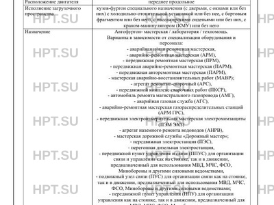 | Назначение | Автофургонмастерская / лаборатория / техпомощь. Варианты в зависимости от специализации оборудования и персонала: - аварийная и/или ремонтная мастерская, - аварийно-ремонтная мастерская (АРМ), - передвижная ремонтная мастерская (ПРМ), - передвижная аварийно-ремонтная мастерская (ПАРМ), - передвижная авторемонтная мастерская (ПАРМ), - мастерская аварийно-восстановительных работ (МАВР); - агрегат ремонтно-сварочный (АРС), - передвижной комплекс сварочных работ (ПКСР), - автомобиль ремонта магистрального газопровода (АМГ), - аварийная газовая служба (АГС), - аварийно-ремонтная мастерская газораспределительных станций (АРМ ГРС), - передвижная электроизмерительная мастерская электрохимзащиты (ПЭМ ЭХЗ) - агрегат наземного ремонта водоводов (АНРВ), - мастерская дорожной службы "Дорожный мастер"; - передвижная электростанция (ПЭС), - перегонная дизельная электростанция, - передвижной пункт управления и связи (ППУС) для организации связи и управления как на стоянке, так и в движении, предназначенный для использования МВД, МЧС, ФСО, Минобороны и другими силовыми ведомствами, - подвижный узел связи (ПУС) для организации связи как на стоянке, так и в движении, предназначенный для использования МВД, МЧС, ФСО, Минобороны и другими силовыми ведомствами; - передвижной пункт управления (ППУ) для организации управления как на стоянке, так и в движении, предназначенный для использования МВД, МЧС, ФСО, Минобороны и другими силовыми ведомствами, - командно-штабная машина (КШМ) для организации командования как на стоянке, так и в движении, предназначенный для использования МВД, МЧС, ФСО, Минобороны и другими силовыми ведомствами, - передвижная лаборатория связи, - передвижная лаборатория телемеханики; - передвижная лаборатория контроля измерительных приборов и автоматики (ЛКИПиА) - передвижная лаборатория электрохимзащиты, - передвижная лаборатория неразрушающего контроля (ЛНК) передвижная лаборатория высоковольтных испытаний (ЛВИ), - передвижная электротехническая лаборатория, - передвижная лаборатория контроля технического состояния трубопроводов (ЛКТСТ), - передвижная лаборатория контроля качества сварных соединений (ЛККСС); - передвижная лаборатория волоконно-оптических линий связи (ВОЛС), - передвижная лаборатория технического, радиологического контроля и дефектоскопии, - передвижная лаборатория исследования оптоволоконного кабеля (ЛИОК), - лаборатория специальная МВД, МЧС, ГИБДД, СК, ФСБ, - передвижная лаборатория исследования скважин, - передвижная лаборатория контроля качества нефтепродуктов, - передвижная лаборатория радиологического контроля; - передвижная экологическая лаборатория, - передвижная метрологическая лаборатория, - передвижная кинологическая лаборатория, - жилой модуль, - передвижная библиотека, - передвижной класс, - передвижной офис, - передвижной клуб, - передвижной кинотеатр, - передвижная баня; - передвижная техническая помощь (Техпомощь), - транспортно-бытовая машина, - передвижная мастерская 5759BF, - криминалистическая лаборатория; для перевозки оборудования, инструмента, приспособлений, приборов и использования его как внутри, так и вне ТС, а также для доставки персонала (бригады) в фургоне Автомобиль для перевозки опасных грузов Автомобиль-фургон хлебный / автофургон-мороженица, для перевозки хлебобулочных издел