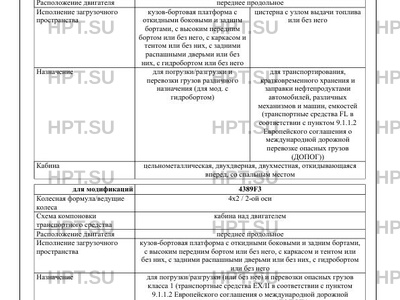 | Назначение | для погрузки/разгрузки и перевозки грузов различного назначения (для мод. с гидробортом) для транспортирования, кратковременного хранения и заправки нефтепродуктами автомобилей, различных механизмов и машин, емкостей (транспортные средства FL в соответствии с пунктом 9.1.1.2 Европейского соглашения о международной дорожной перевозке опасных грузов (ДОПОГ)) для погрузки/разгрузки (или без нее) и перевозки опасных грузов класса 1 (транспортные средства EX/II в соответствии с пунктом 9.1.1.2 Европейского соглашения о международной дорожной перевозке опасных грузов (ДОПОГ)) |