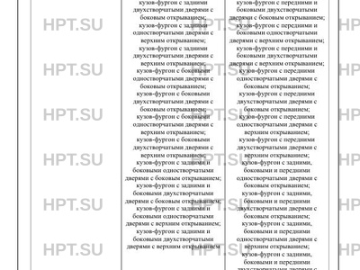 | Исполнение загрузочного пространства | кузов-фургон с задними одностворчатыми дверями с боковым открыванием; кузов-фургон с задними двухстворчатыми дверями с боковым открыванием; кузов-фургон с задними одностворчатыми дверями с верхним открыванием; кузов-фургон с задними двухстворчатыми дверями с верхним открыванием; кузов-фургон с боковыми одностворчатыми дверями с боковым открыванием; кузов-фургон с боковыми двухстворчатыми дверями с боковым открыванием; кузов-фургон с боковыми одностворчатыми дверями с верхним открыванием; кузов-фургон с боковыми двухстворчатыми дверями с верхним открыванием; кузов-фургон с задними и боковыми одностворчатыми дверями с боковым открыванием; кузов-фургон с задними и боковыми двухстворчатыми дверями с боковым открыванием; кузов-фургон с задними и боковыми одностворчатыми дверями с верхним открыванием; кузов-фургон с задними и боковыми двухстворчатыми дверями с верхним открыванием кузов-фургон с передними и боковыми одностворчатыми дверями с боковым открыванием; кузов-фургон с передними и боковыми двухстворчатыми дверями с боковым открыванием; кузов-фургон с передними и боковыми одностворчатыми дверями с верхним открыванием; кузов-фургон с передними и боковыми двухстворчатыми дверями с верхним открыванием; кузов-фургон с передними одностворчатыми дверями с боковым открыванием; кузов-фургон с передними двухстворчатыми дверями с боковым открыванием; кузов-фургон с передними одностворчатыми дверями с верхним открыванием; кузов-фургон с передними двухстворчатыми дверями с верхним открыванием; кузов-фургон с задними, боковыми и передними одностворчатыми дверями с боковым открыванием; кузов-фургон с задними, боковыми и передними двухстворчатыми дверями с боковым открыванием; кузов-фургон с задними, боковыми и передними одностворчатыми дверями с верхним открыванием; кузов-фургон с задними, боковыми и передними двухстворчатыми дверями с верхним открыванием; кузов-фургон с задней откидной дверью-трапом; кузов-фургон с задней откидной дверью-трапом и боковыми одностворчатыми дверями с боковым открыванием; кузов-фургон с задней откидной дверью-трапом и боковыми двухстворчатыми дверями с боковым открыванием; кузов-фургон с задней откидной дверью-трапом и боковыми одностворчатыми дверями с верхним открыванием; кузов-фургон с задней откидной дверью-трапом и боковыми двухстворчатыми дверями с верхним открыванием; кузов-фургон с задней откидной дверью-трапом с боковыми и передними одностворчатыми дверями с боковым открыванием; кузов-фургон с задней откидной дверью-трапом с боковыми и передними двухстворчатыми дверями с боковым открыванием; кузов-фургон с задней откидной дверью-трапом с боковыми и передними одностворчатыми дверями с верхним открыванием; кузов-фургон с задней откидной дверью-трапом с боковыми и передними двухстворчатыми дверями с верхним открыванием; кузов-фургон с задней откидной дверью-трапом и передними одностворчатыми дверями с боковым открыванием; кузов-фургон с задней откидной дверью-трапом и передними двухстворчатыми дверями с боковым открыванием; кузов-фургон с задней откидной дверью-трапом и передними одностворчатыми дверями с верхним открыванием; кузов-фургон с задней откидной дверью-трапом и передними двухстворчатыми дверями с верхни