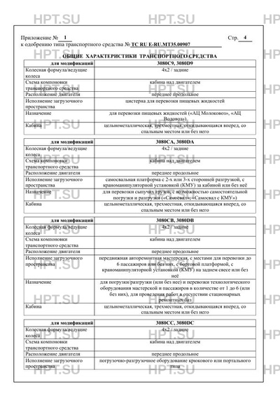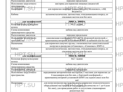 | Оборудование ТС | кондиционер (хладагент R134a); устройство вызова экстренных оперативных служб; специальный предупреждающий огонь автожелтого цвета (для мод. 3080C8, 3080D8 и мод. 3080C5, 3080D5, 3080CB, 3080DB в исполнении "Дорожный мастер") по заказу: зеркала заднего вида с обогревом; аудиосистема; электрические стеклоподъемники; GPS-оборудование; тахограф, обтекатель крыши кабины, боковые двери в фургоне, высокие борта, коробка отбора мощности, предпусковой нагреватель, стеллажи, шкафы, рундуки, сиденья (для использования во время стоянки), столы, дополнительный отопитель, гидравлическое оборудование, дополнительный топливный бак, технологическое оборудование; грузоподъемные борта, холодильная установка, каркасы тентов различной формы с распашными задними воротами или рольставнями или клапан тента, краноманипуляторная установка (КМУ) |